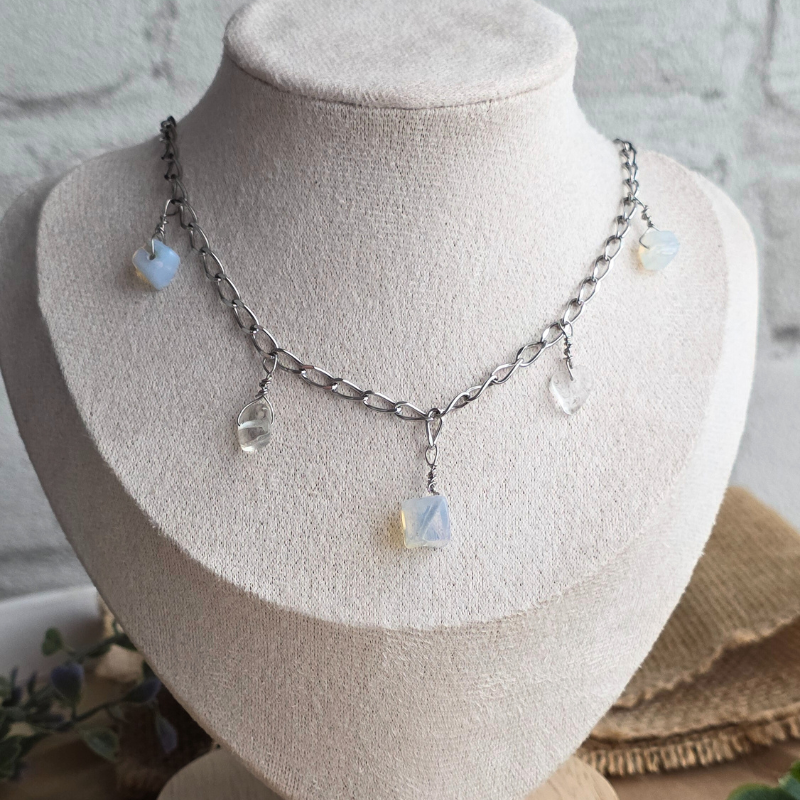 Dieses Schmuckstück fertige ich aus hochwertigem Edelstahl und echten Opalith-Splittern an. Das Material ist wasserfest und behält dauerhaft seine silberne Farbe ohne anzulaufen. Du kannst in der Auswahl direkt wählen, ob du die Halskette, das Armband oder beides zusammen als Set (zum vergünstigten Paketpreis) bestellen möchtest.